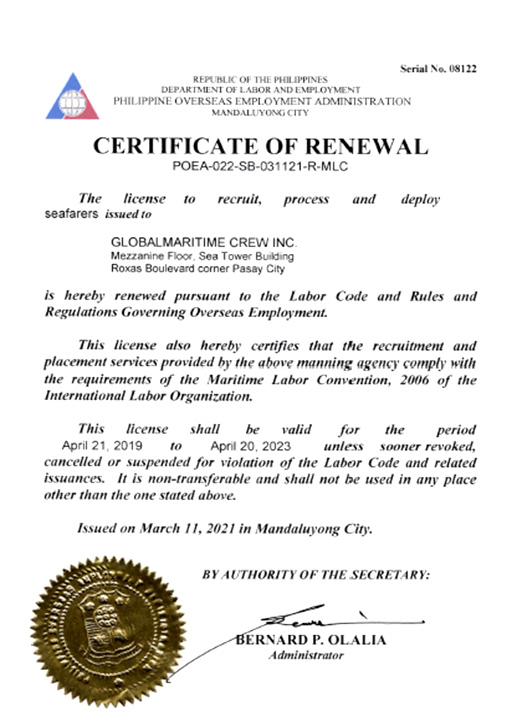 GLOBALMARITIME CREW INC. recruits and employs all ranks from Masters to Messmen
